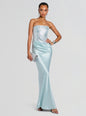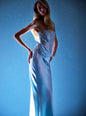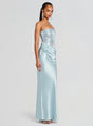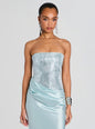 The Alexandra Dress embodies timeless allure with its sleek strapless silhouette and rich satin construction. Delicately adorned with sequins, it strikes the perfect balance of glamour and poise. Shown here in Seychelles.