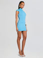 The Anaelle Dress is a refined mini with a mock neck and cap sleeves, crafted from luxurious bandage knit that contours the silhouette. Finished with elegant gold button details and faux pockets, it’s designed for daytime events and warm-weather occasions. Shown here in Metallic Aqua.