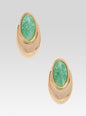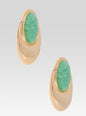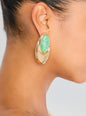 The Blare Earring is a statement piece featuring a luminous oval stone set on a delicate gold plated base. A distinctive overhang design creates a unique silhouette that reflects the light, adding subtle dimension. Shown here in Angelite/Gold.