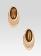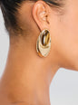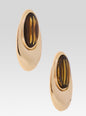 The Blare Earring is a statement piece featuring a luminous oval stone set on a delicate gold plated base. A distinctive overhang design creates a unique silhouette that reflects the light, adding subtle dimension. Shown here in Tigers Eye/Gold.