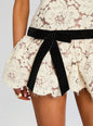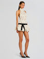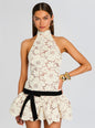 Celebrate the season in the Cicely Lace Dress, a mini featuring a halter neckline and open back design. The drop waist silhouette creates an elegant line, while the bubble hem adds playful movement to the skirt. Crafted in lace fabric over a semi sheer nude lining for comfort and coverage, this dress transitions seamlessly from cocktail hour to late-night dancing. Shown here in Cream.