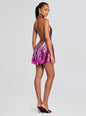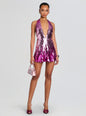 The Kinara Dress is a striking choice for unforgettable nights out. This halter-neck mini features a bold plunging neckline and an ombré fabric finished with all-over shimmering paillettes. A hidden side zipper creates a smooth, streamlined fit, while the halter strap secures with a snap-button closure. Designed to make a statement wherever the night takes you. Shown here in Peony.