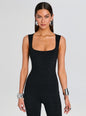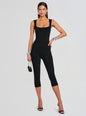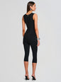 The Leana Jumpsuit blends effortless ease with refined versatility. Crafted from soft knit fabric, this square-neck pedal pusher silhouette moves seamlessly from daytime errands to evening plans. Style it with a blazer, heels, and statement accessories for a polished look. Show here in Metallic Black.
