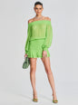 The Taisha Dress is a flirtatious take on an every day frock. This rhinestone embellished off-the-shoulder dress features a smocked skirt, allowing for a body forming fit. Tiered frilling at the hemline gives a feminine touch. Shown here in Lime Punch.