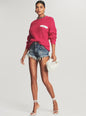 The Valentina Sweater by SER.O.YA is a wardrobe must. This cotton knit is crafted with a contrasting double collar and a suede faux front pocket at the chest. The boyfriend style silhouette can be worn as a dress or paired with your go-to shorts. Shown here in Fuchsia Purple.