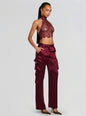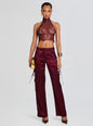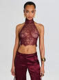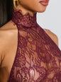 Discover elegance with our Violet Top, boasting delicate lace and a stylish open back. This top is a true fashion statement, combining the allure of lace with a modern edge. The halter neckline and open back design make it a versatile choice, suitable for both casual outings and dressy affairs. Shown here in Port.